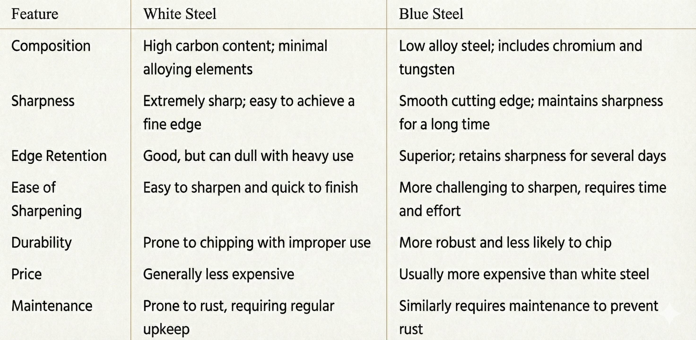 • Ultimately, the blade’s craftsmanship matters as much as the steel. A well-forged White Steel blade can outperform a poorly made Blue Steel. Consider your cooking habits, maintenance comfort level, and respect the skill behind the blade.