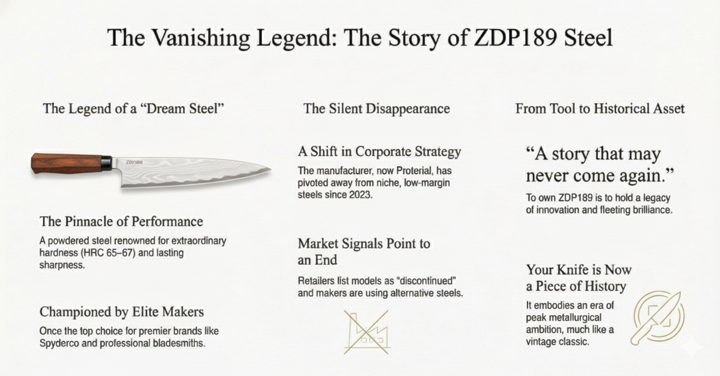 ZDP189 steel is quietly fading from production, turning every existing blade into a rare artifact of metallurgical history.