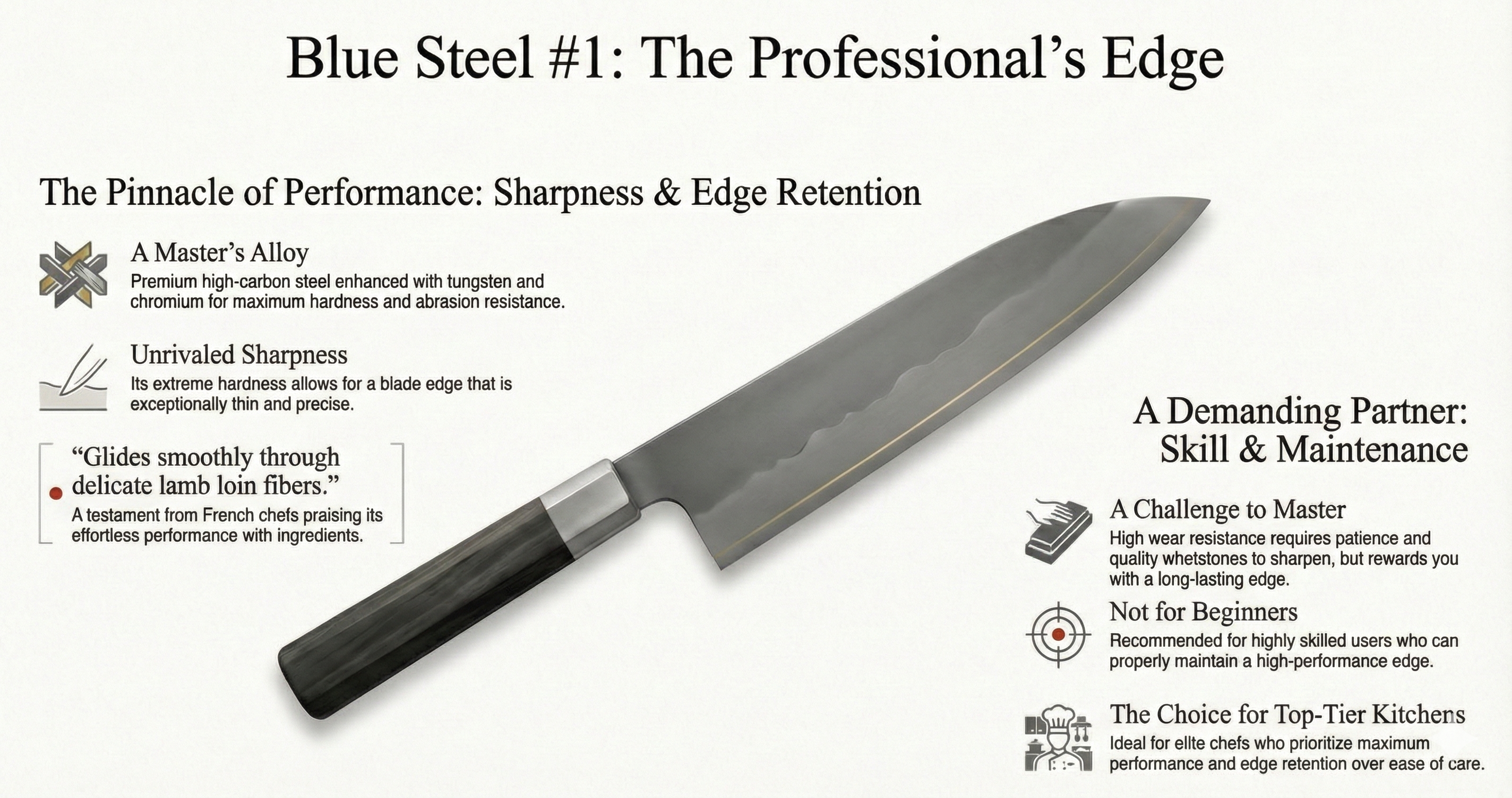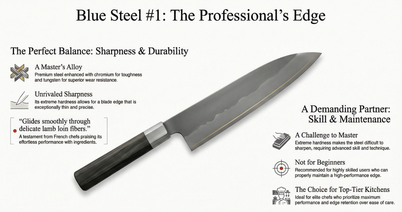 For top-tier kitchens that demand maximum edge retention and uncompromising precision, Blue Steel #1 stands as the steel of choice—powerful, exacting, and worthy of expert hands. -