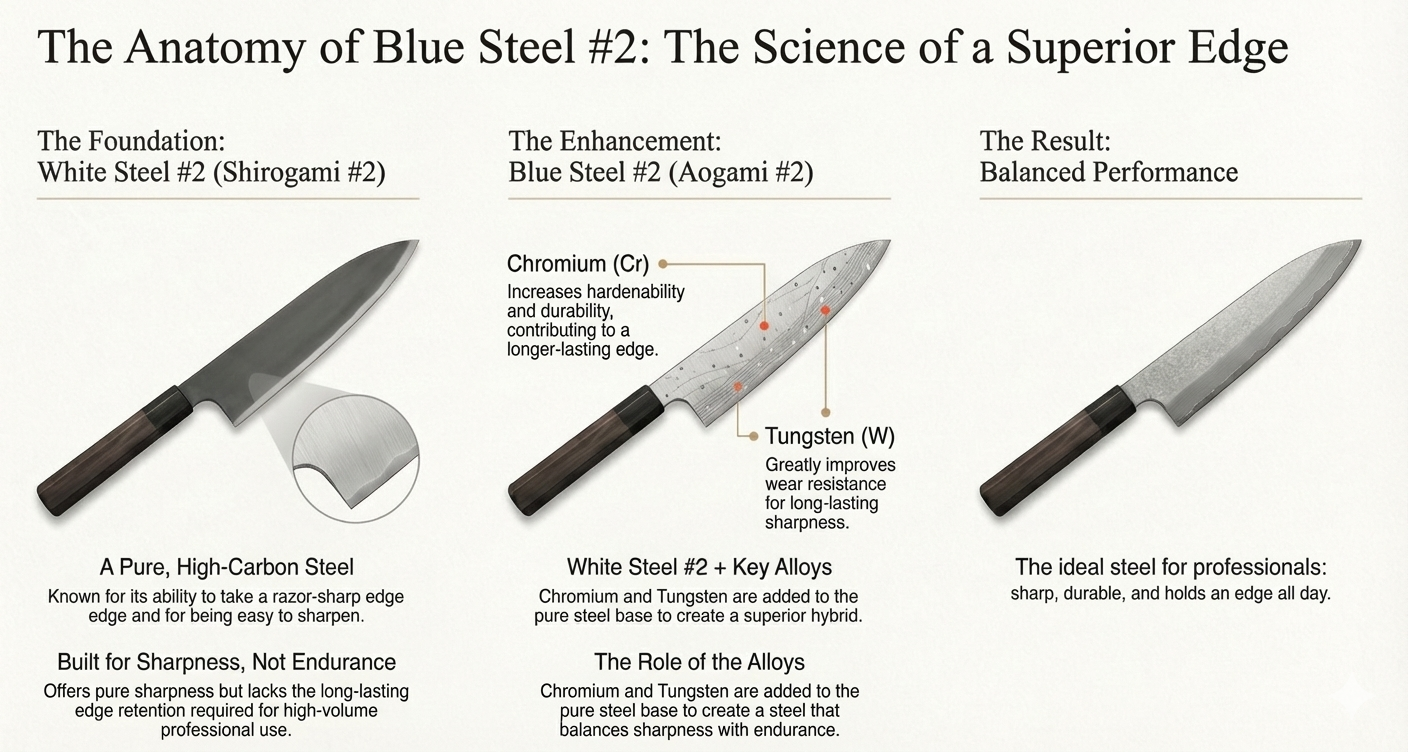 Blue Steel #2 (Aogami #2) is more than just a high-end alloy steel — its true value lies in its remarkable balance of elements. The secret to its performance in the kitchen starts at the microscopic level: in the composition of its material.