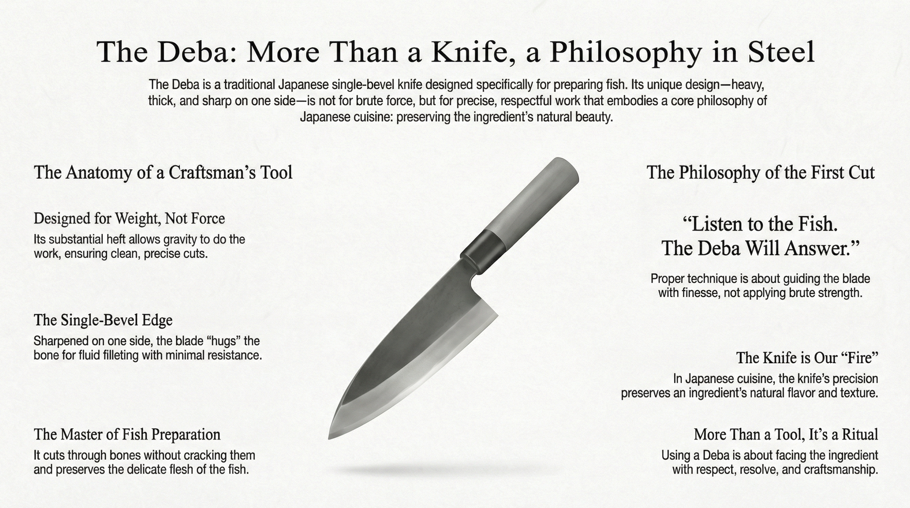 But in Japanese cuisine, the goal is to preserve the ingredient’s natural beauty and flavor. That’s why the knife is, in a sense, our “fire.”So the Deba is not just a knife—it’s a philosophy held in steel. It reflects how we approach food, respect life, and craft flavor from the very first cut.
