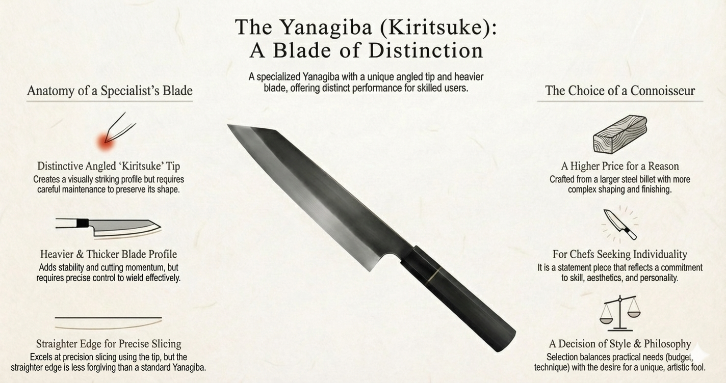 Yanagiba (Kiritsuke) knives are generally more expensive than standard Yanagiba of the same length, as their design requires a larger steel billet and more shaping. Choosing between them depends on your cutting style, how much you value tip precision, and your budget.