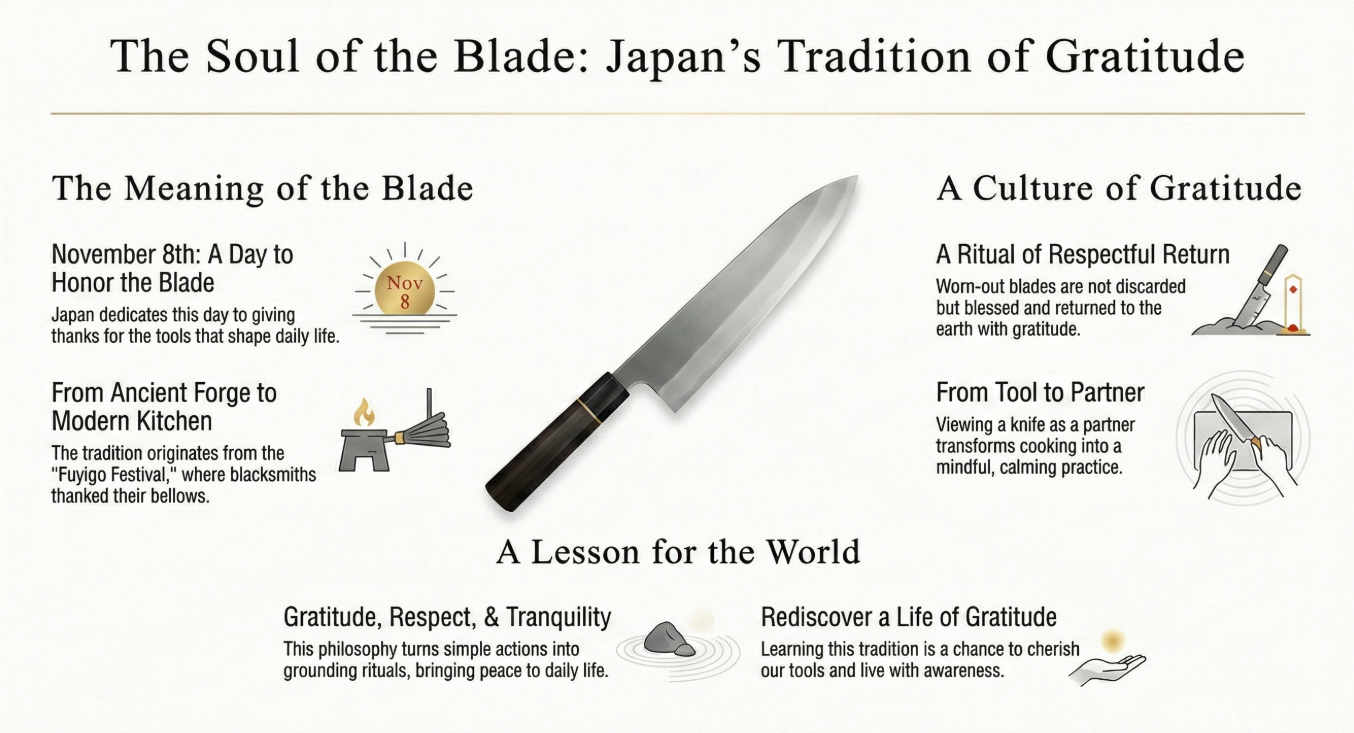 Cette tradition est connue sous le nom de Hocho Kuyō, la cérémonie commémorative du couteau. Elle reflète la croyance selon laquelle les objets précieux acquièrent une âme avec le temps. En rendant grâce à un couteau usé, on exprime sa gratitude pour le savoir-faire qui l'a créé et pour le dévouement avec lequel il a été utilisé.
