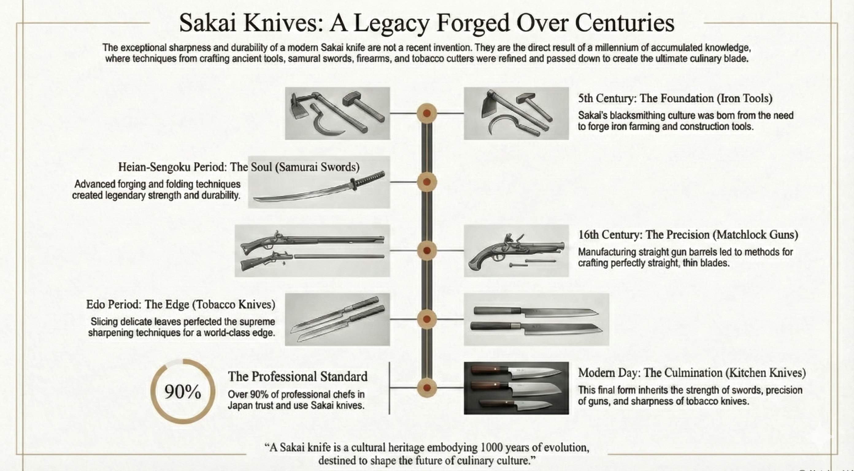 La tradition de forge de Sakai a commencé avec des outils en fer à l'époque Kofun, a évolué vers la fabrication d'épées, s'est adaptée aux armes à feu, est passée aux couteaux à tabac et a finalement conduit à la création de couteaux de cuisine de classe mondiale .