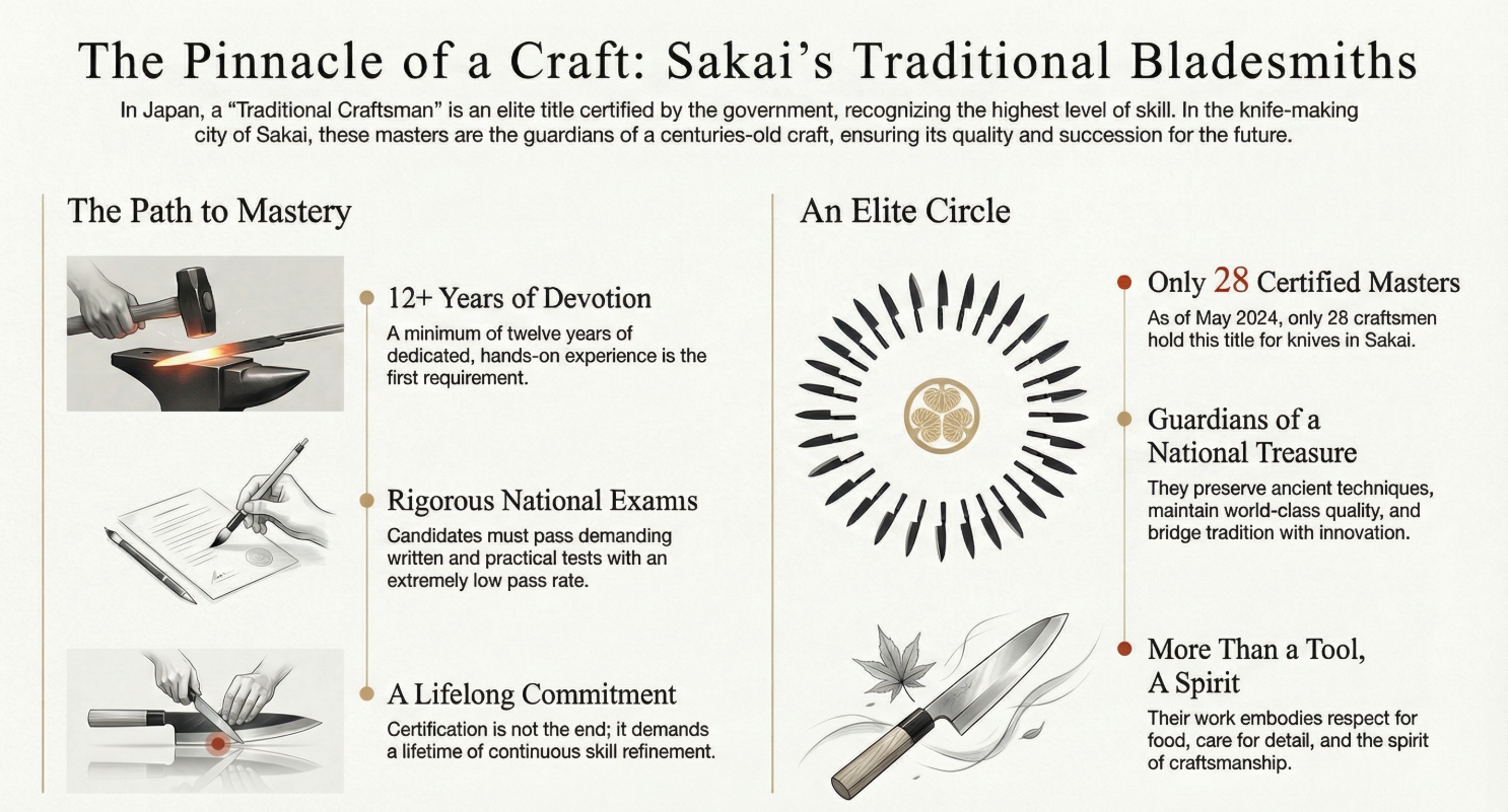 Au Japon, certains savoir-faire se transmettent depuis des siècles et sont appelés « artisanats traditionnels ». Ceux qui perpétuent ces traditions sont bien plus que de simples artisans : ce sont des « artisans traditionnels », officiellement certifiés par le gouvernement japonais pour leur savoir-faire exceptionnel. À Sakai, ville réputée pour ses couteaux de cuisine, seuls quelques artisans triés sur le volet obtiennent ce titre prestigieux.