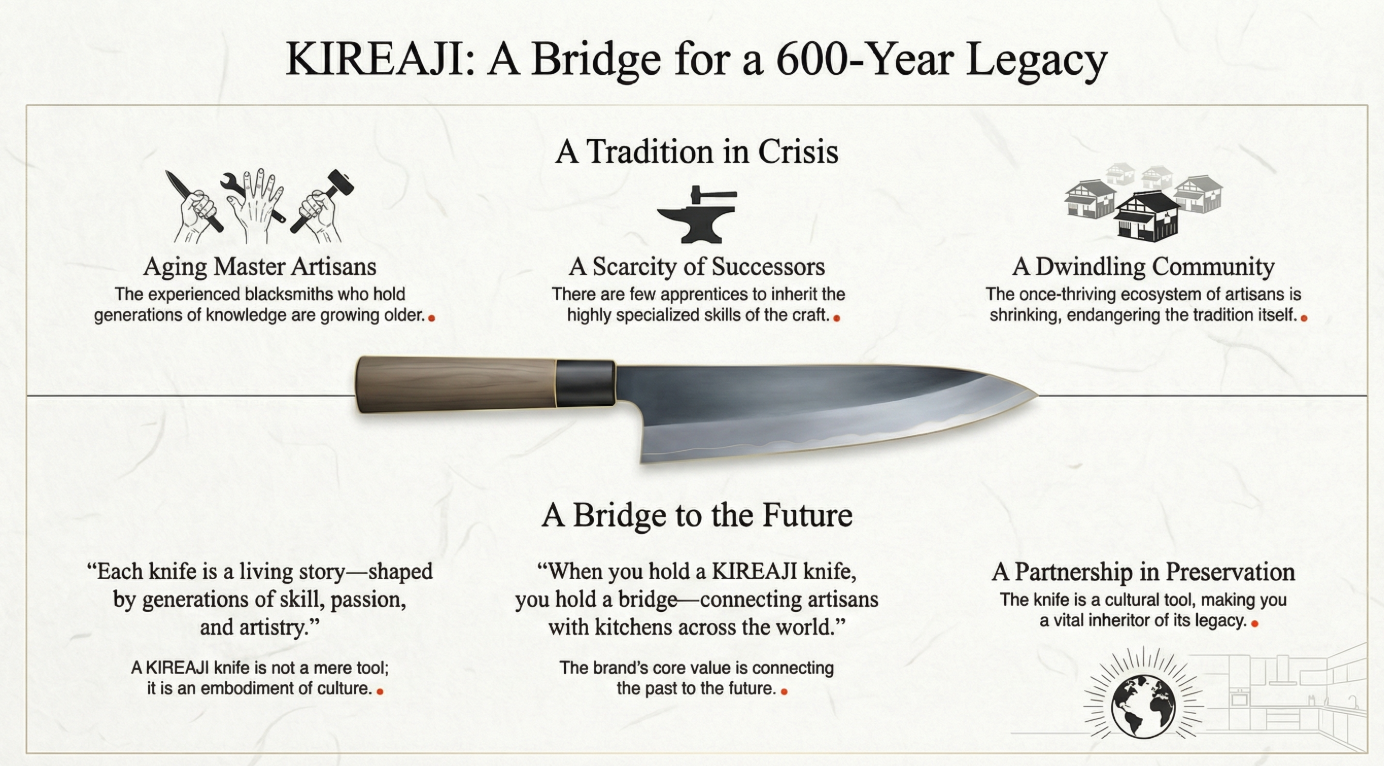 When you hold a KIREAJI knife, you hold more than a tool. You hold a bridge—connecting the heart of Japanese artisans with kitchens across the world, linking past to future, tradition to innovation.
