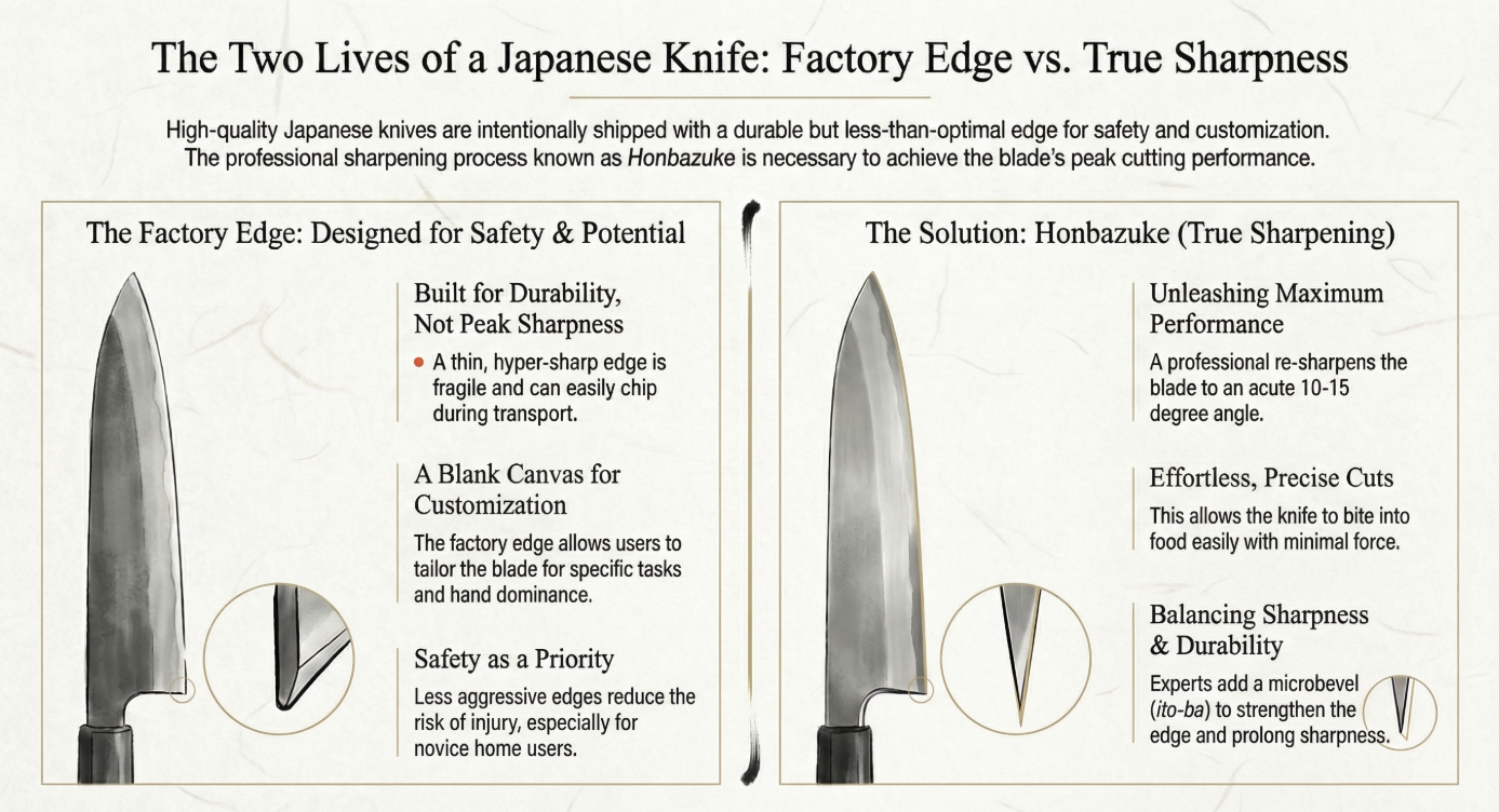 This is intentional. To protect the blade during transport and allow room for personalization, the final sharpening—called Honbazuke—is left for the craftsman or the user.