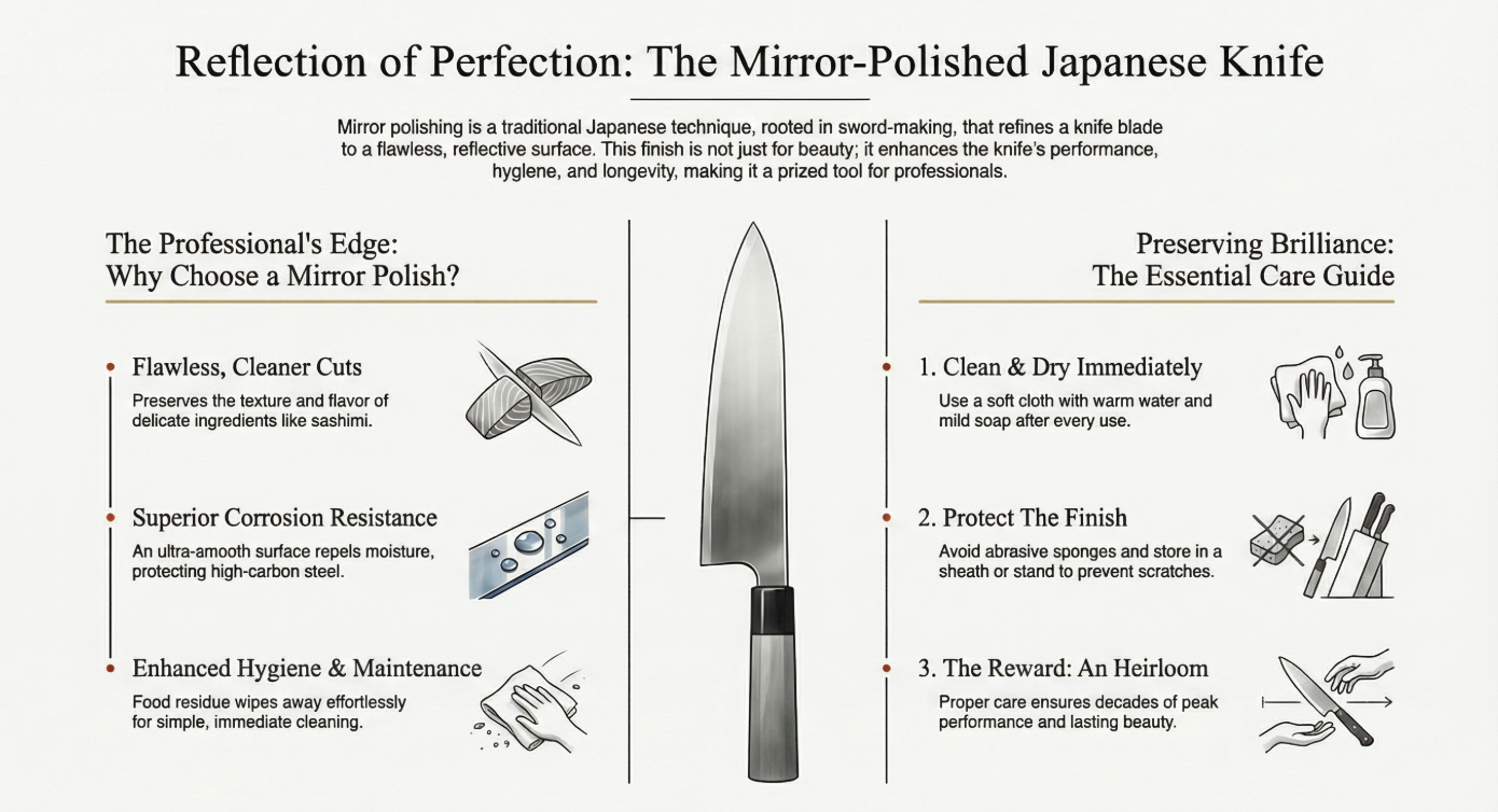 A mirror-polished Japanese knife is not only a kitchen instrument. It is art, heritage, and precision in one—a blade that embodies centuries of craftsmanship. Owning one is not just a purchase; it is an invitation to experience the joy of cooking at its highest level, and to pass forward a tradition worth preserving.