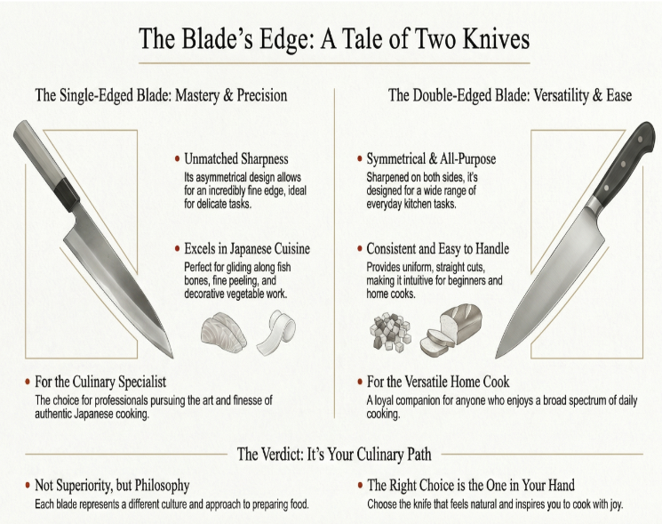Across kitchens worldwide, two distinct knife philosophies have taken shape—the refined precision of Japanese single-edge blades and the practical versatility of Western double-edge knives. Their differences go beyond design; they reflect deep-rooted values about food, technique, and craftsmanship.