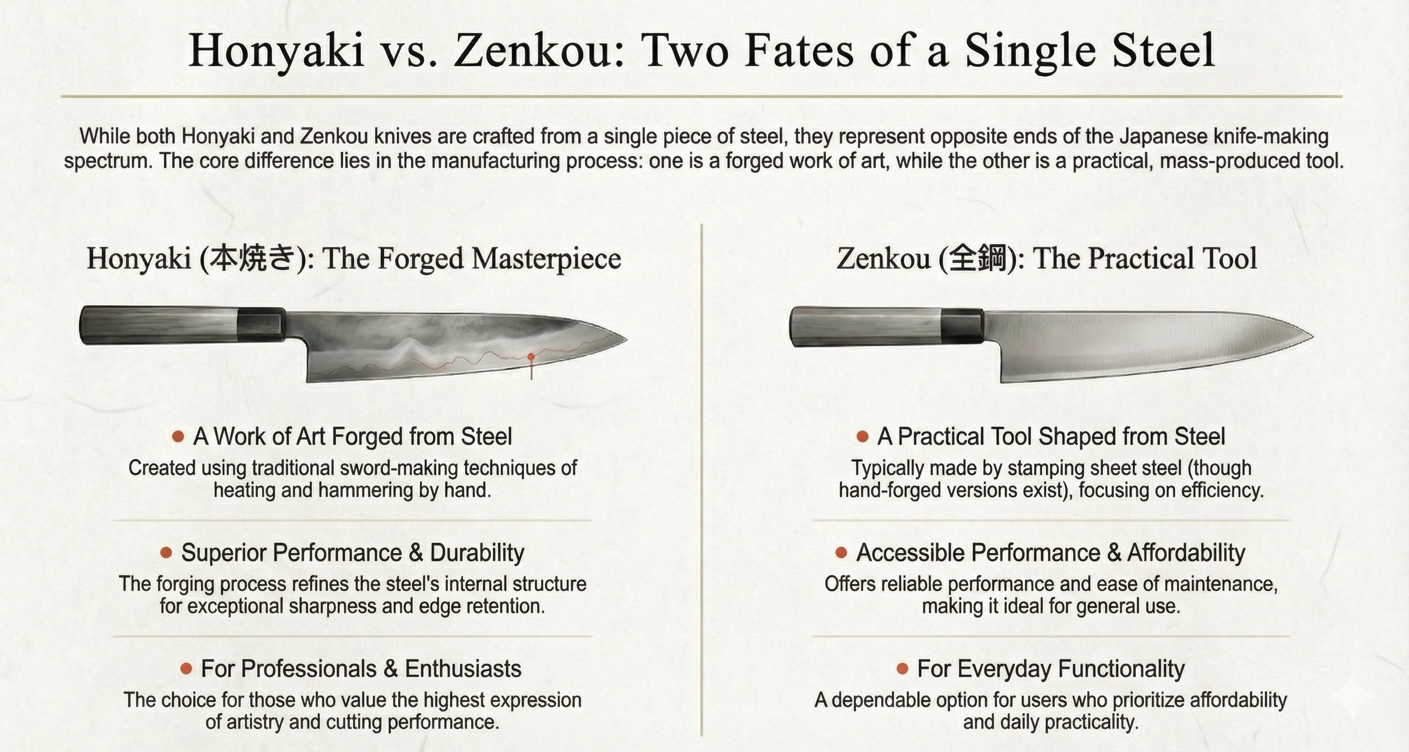 Honyaki is forged into a refined masterpiece, while Zenkou is shaped into an accessible, practical blade.