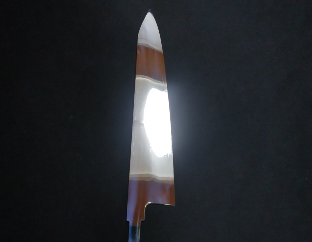 *This knife is made from a three-layer steel of ZDP189 and SUS420J2. Despite being three-layer steel, it has been thoroughly hardened, boasting a hardness comparable to honyaki knives. The core ZDP189 reaches HRC67, while the SUS layer is 62±1, making it extremely hard and difficult to sharpen. As a result, this knife is challenging for beginners to handle.