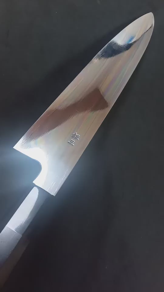 这把牛刀由认证工匠山塚翔吾手工锻造,并由其子山塚耕平精心打磨,体现了山塚家族的传承。它采用银山钢精制而成,镜面抛光无瑕,搭配乌木刀柄和水牛角套圈,将美感、平衡与日本工匠精神完美融合。