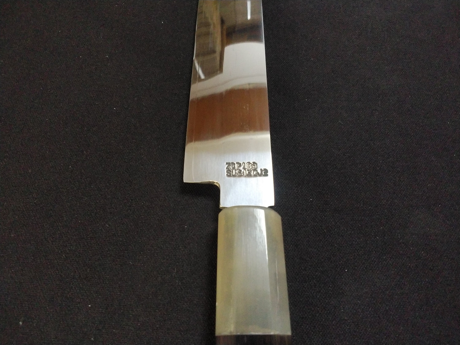 *此刀由ZDP189和SUS420J2三层钢制成。虽然是三层钢,但经过彻底硬化,硬度可与本烧刀媲美。核心ZDP189达到HRC67,而SUS层为62±1,非常坚硬且难以磨砺。因此,对于初学者来说,这把刀很难掌握。